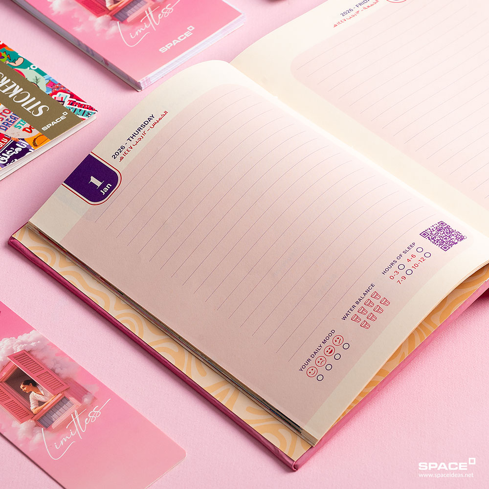 : Daily Agenda 2026 , Stickers Booklet , Pen , Haram Complete-2 Game , Todo List , Activity Booklet , Wall Planner , 2 Bookmarks , Mini Desk Calendar , 2 Coasters [Double Layers] , Gift Card
